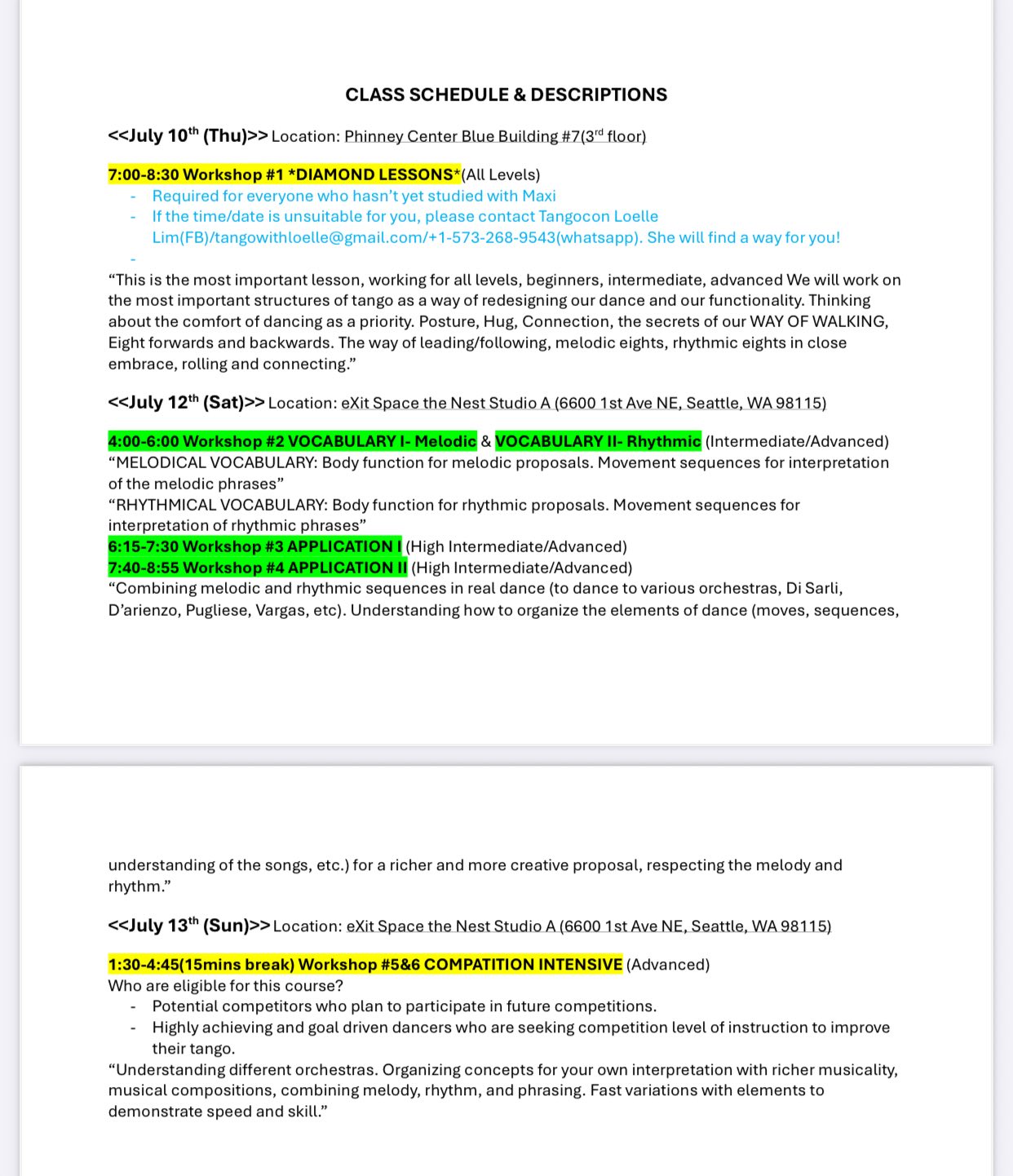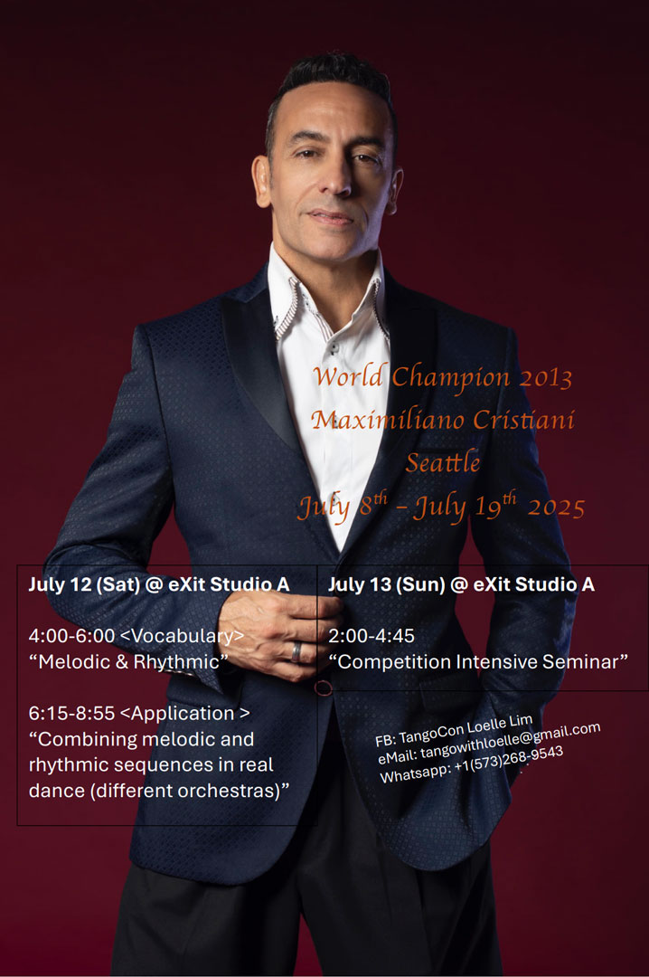 Update 6/30: Dear friends, Please check out this urgent update on Maximiliano Cristiani II’s workshop schedule! And I apologize for super last minute changes. Maxi’s Chicago event plans on July 11th has extended to BOTH July 10th and 11th. So we had to move the “Diamond” class from July 10th(Thu) to July 8th(Tue), but the same time 7:00-8:15pm, at the same building as the Wednesday practica, Phinney Center Lower Brick Building Room 35 (upper floor). According to this change, his private lesson availability has slightly changed. Please check the recently updated schedule.